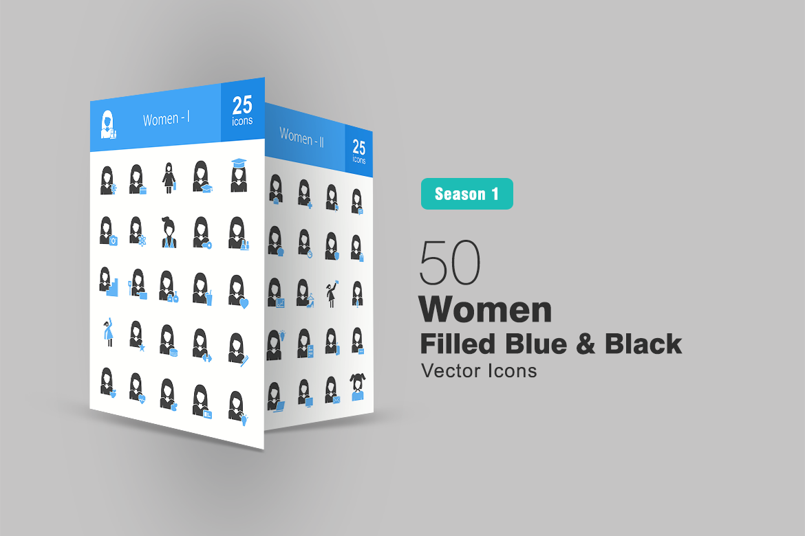 Download Набор иконок "50 Women Filled Blue & Black Icon Set" / 50 Women Filled Blue & Black Icon Set - Набор иконок на тему графика woman,icon,women,lady,female,girl,avatar,user,face,social,human,businesswoman,educated,working,stylish,sports,ladies,feminine,feminist,iconbunny