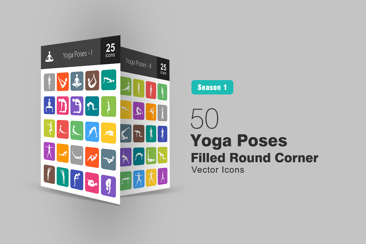 Download Набор иконок "50 Yoga Poses Filled Round Corner Icon Set" / 50 Yoga Poses Filled Round Corner Icon Set - Набор иконок на тему графика yoga,icon,pose,toes,bridge,buddhist,camel,cat,cobra,hare,extended,fish,boat,knee,press,lunge,mountain,plank,plow,headstand