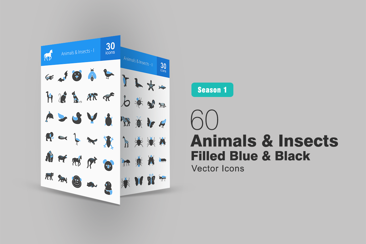 Download Набор иконок "60 Animals & Insects Filled Blue & Black Icon Set" / 60 Animals & Insects Filled Blue & Black Icon Set - Набор иконок на тему графика animals icon insects elephant snake horse lion bug fly butterfly sheep goat fish bird bee bear monkey frog iconbunny flat