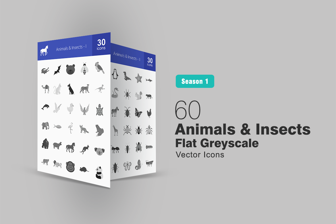 Download Набор иконок "60 Animals & Insects Flat Greyscale Icon Set" / 60 Animals & Insects Flat Greyscale Icon Set - Набор иконок на тему графика animals icon insects elephant snake horse lion bug fly butterfly sheep goat fish bird bee bear monkey frog iconbunny flat