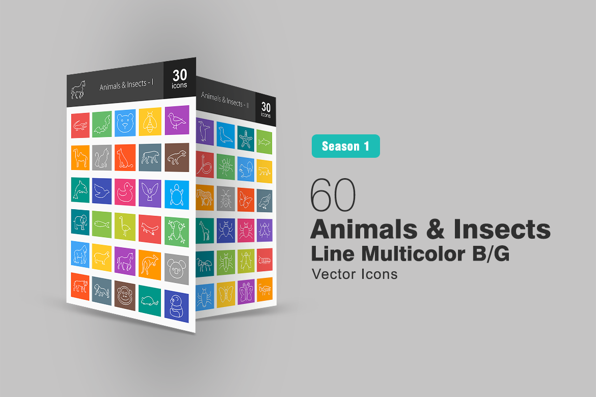 Download Набор иконок "60 Animals & Insects Line Multicolor B/G Icon Set" / 60 Animals & Insects Line Multicolor B/G Icon Set - Набор иконок на тему графика animals icon insects elephant snake horse lion bug fly butterfly sheep goat fish bird bee bear monkey frog iconbunny flat