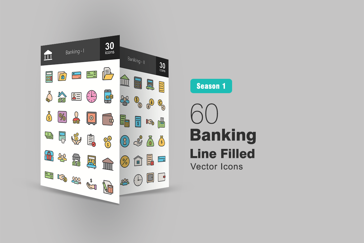 Download Набор иконок "60 Banking Filled Line Icon Set" / 60 Banking Filled Line Icon Set - Набор иконок на тему графика banking icons bank accounts finance accountant customer calculation billing cheque demand draft account vault money monetary donation currency economy iconbunny