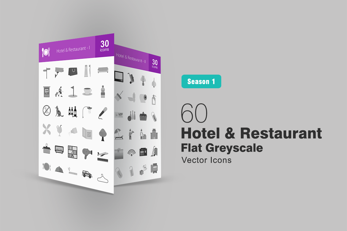 Download Набор иконок "60 Hotel & Restaurant Flat Greyscale Icon Set" / 60 Hotel & Restaurant Flat Greyscale Icon Set - Набор иконок на тему графика hotel,icon,restaurant,vacations,luggage,aeroplane,dinner,cigarette,van,security,lock,directions,drink,bed,waiter,lunch,wifi,connection,bowling,beach