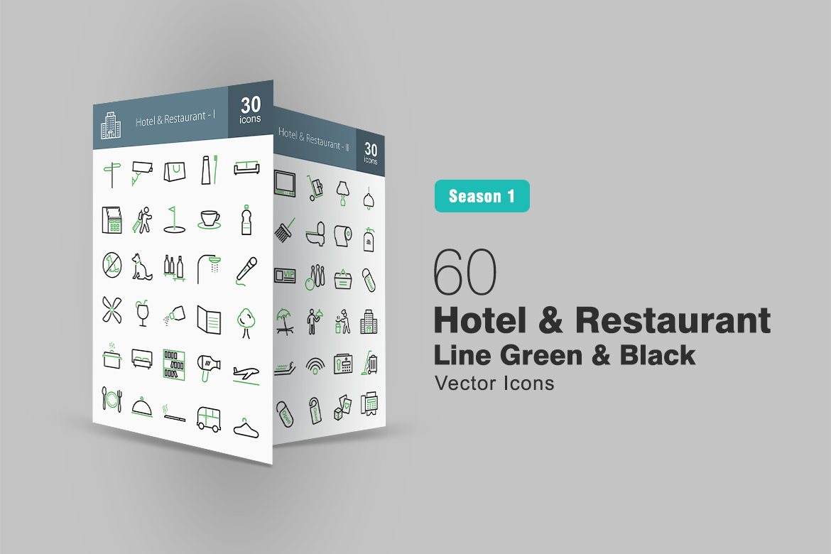 Download Набор иконок "60 Hotel & Restaurant Line Green & Black Icon Set" / 60 Hotel & Restaurant Line Green & Black Icon Set - Набор иконок на тему графика hotel icon restaurant vacations luggage aeroplane dinner cigarette van security lock directions drink bed waiter lunch wifi connection bowling beach