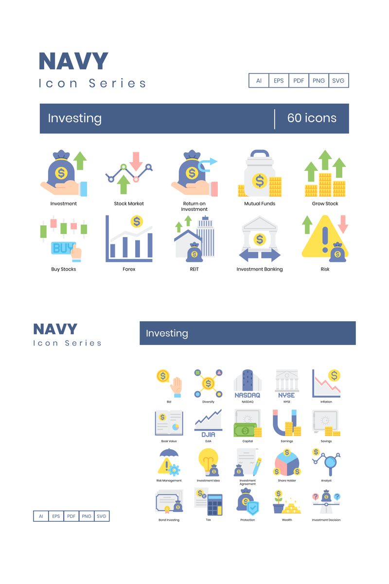 Download Набор иконок "60 Investing Icons - Navy Series Set" / 60 Investing Icons - Navy Series Set - Набор иконок на тему графика
