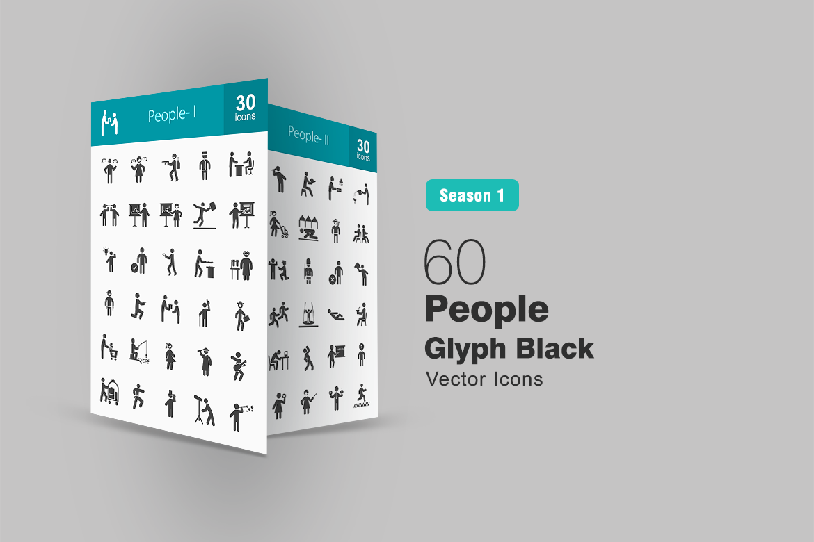 Download Набор иконок "60 People Glyph Icon Set" / 60 People Glyph Icon Set - Набор иконок на тему графика people,icon,human,soldier,waiter,boss,chef,chemist,cowboy,criminal,child,magician,man,girl,ninja,police,reading,presenting,jumping,saluting