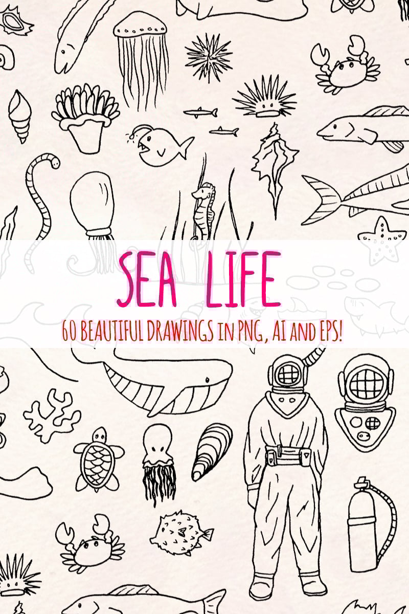 Download Иллюстрация "60 Sea and Ocean Creature - Illustration" / 60 Sea and Ocean Creature - Illustration - Иллюстрация на тему графика graphics blog illustration vector commercial use hand drawn line art ocean clip nautical digital download kit