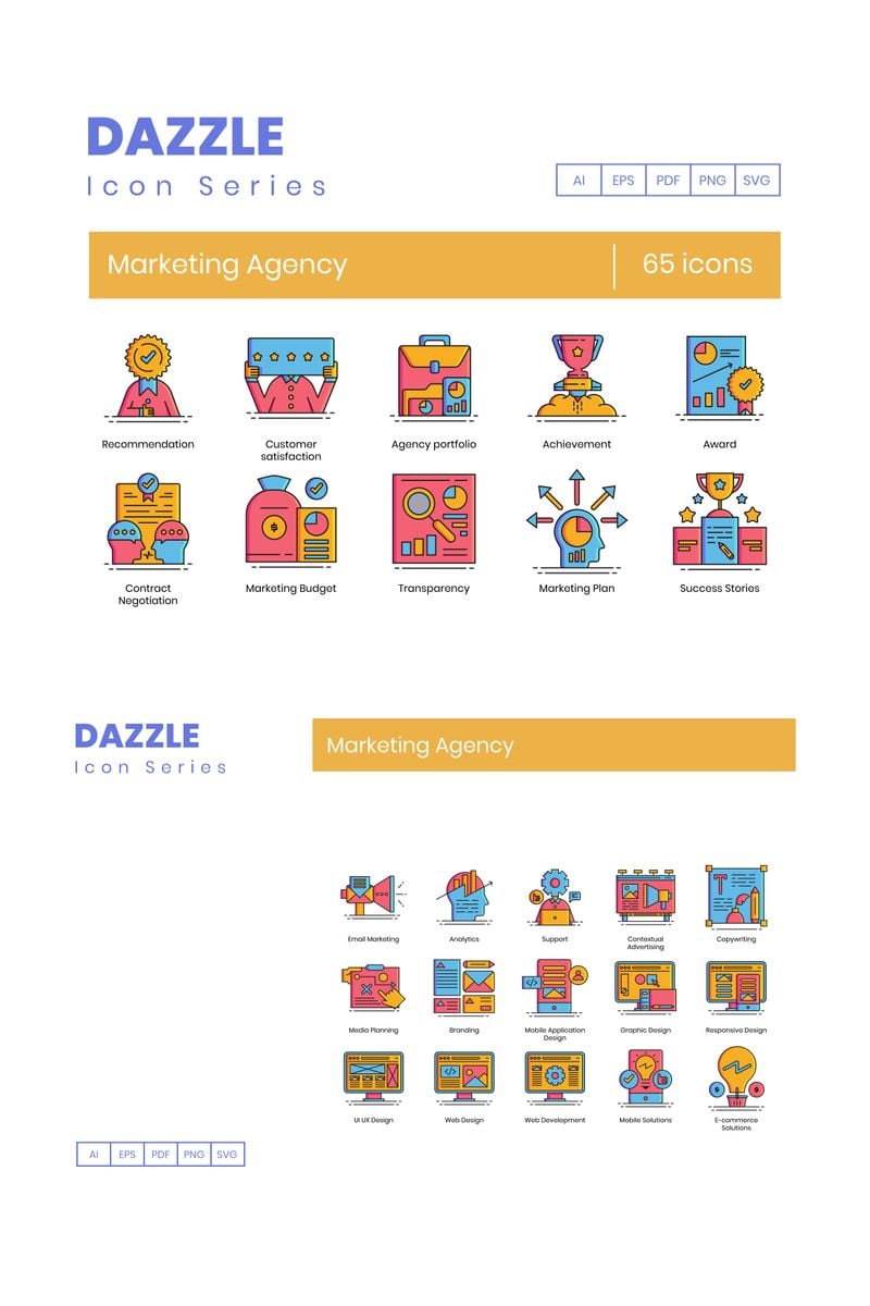 Download Набор иконок "65 Marketing Agency Icons - Dazzle Series Set" / 65 Marketing Agency Icons - Dazzle Series Set - Набор иконок на тему графика