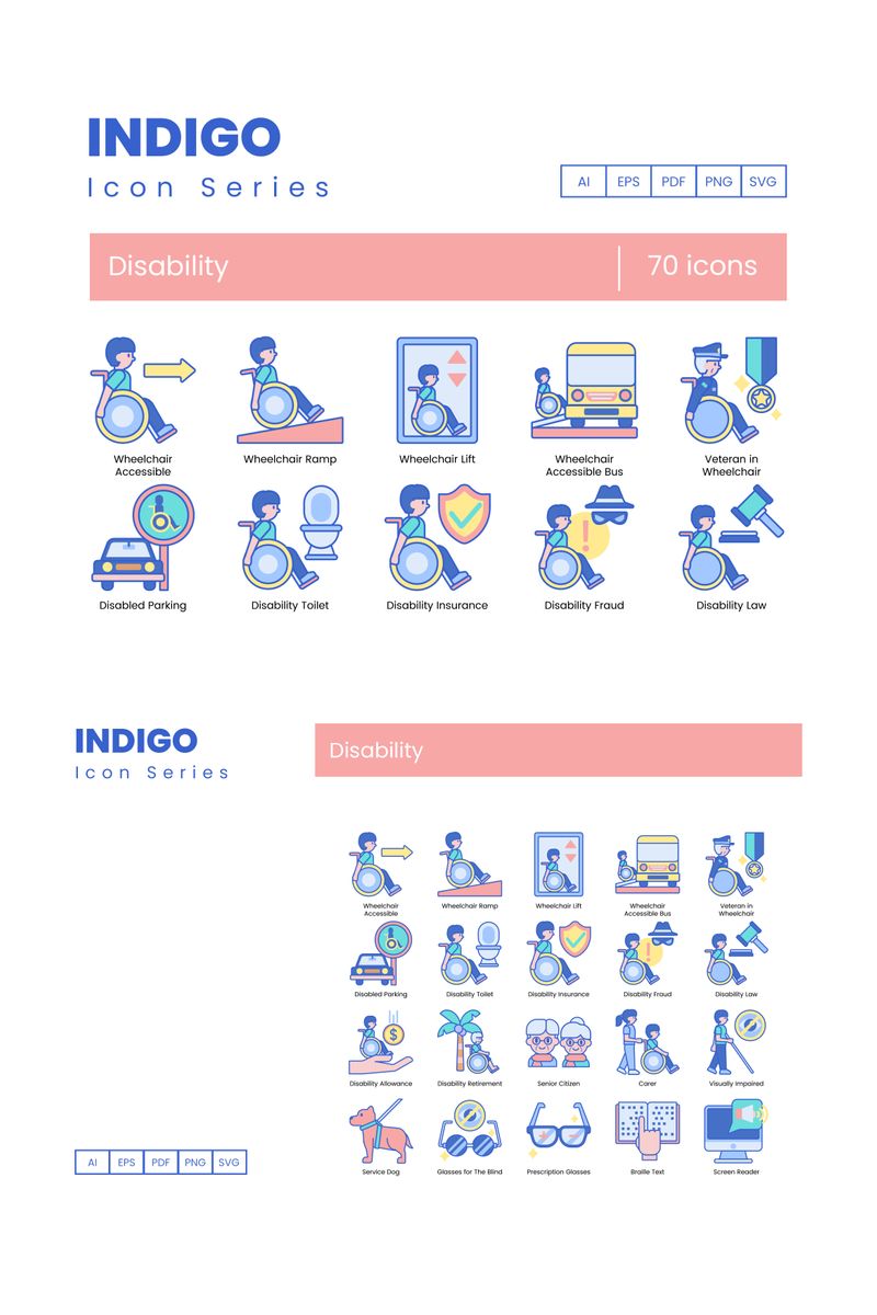 Download Набор иконок "70 Disability Icons - Indigo Series Set" / 70 Disability Icons - Indigo Series Set - Набор иконок на тему графика