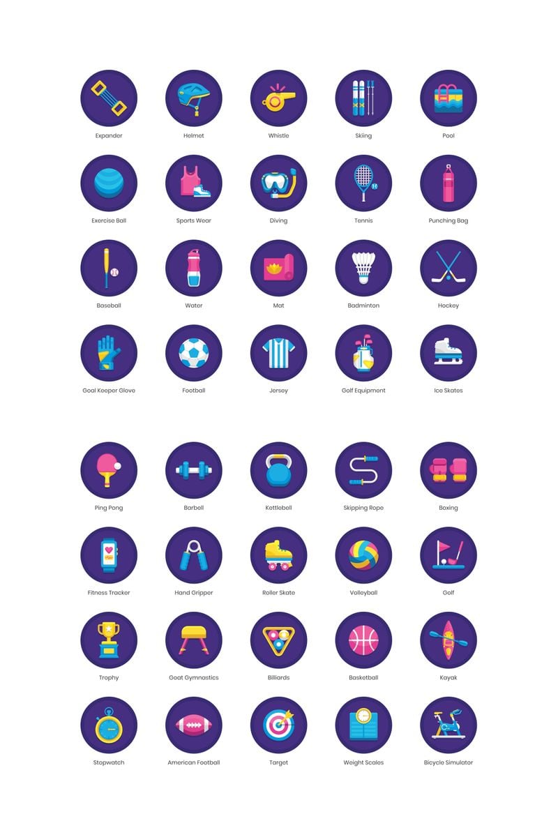 Download Набор иконок "70 Sports Equipment Icons - Orchid Series Set" / 70 Sports Equipment Icons - Orchid Series Set - Набор иконок на тему графика