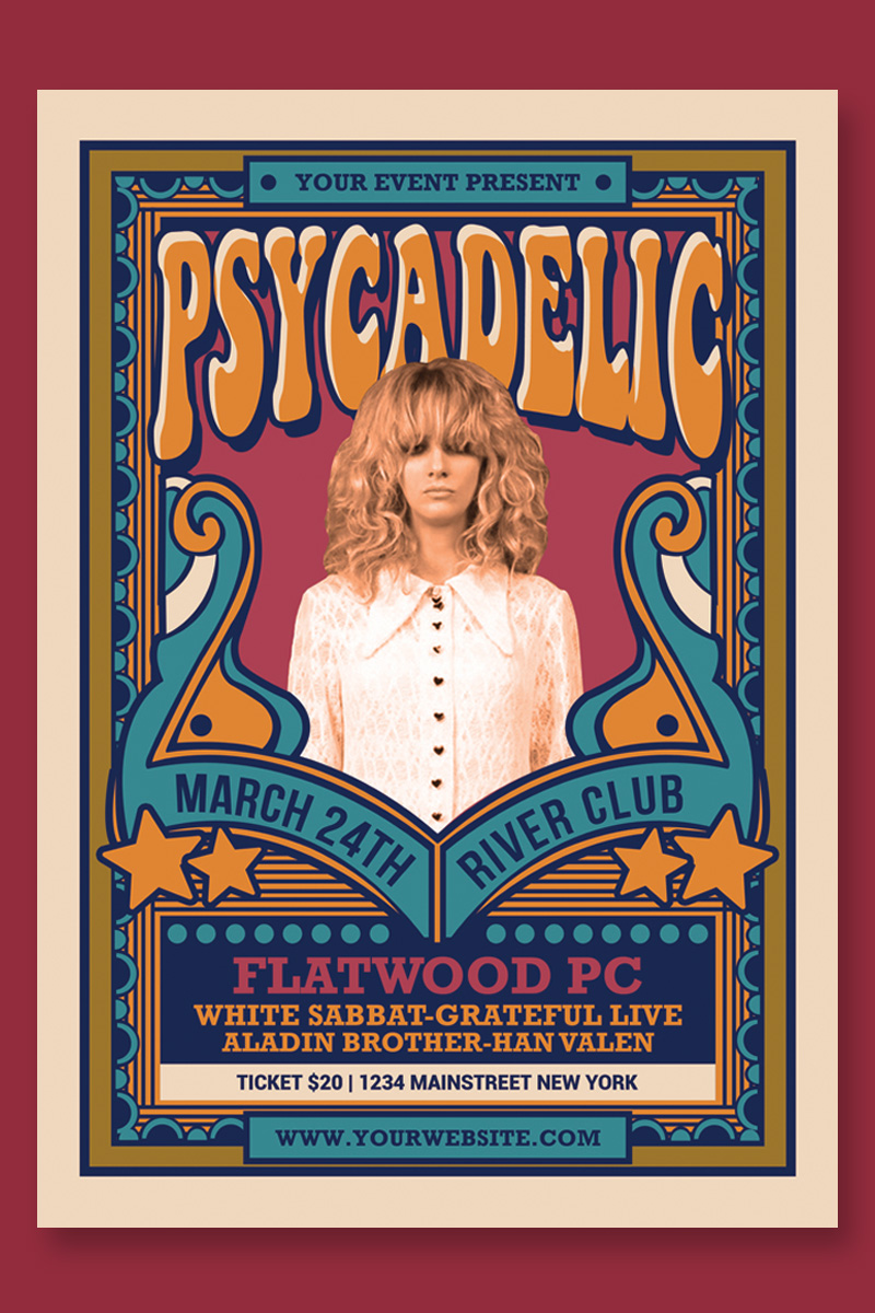 Download Фирменный стиль "70's Psychedelic Music Flyer - Corporate Identity Template" / 70's Psychedelic Music Flyer - Corporate Identity Template - Фирменный стиль на тему графика 60s 70s alternative blues classic concert festival flyer gig grunge hits indie jazz magazine old school oldies party post print