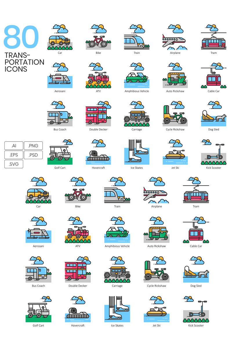 Download Набор иконок "80 Transportation Icons - Aesthetic Series Set" / 80 Transportation Icons - Aesthetic Series Set - Набор иконок на тему графика