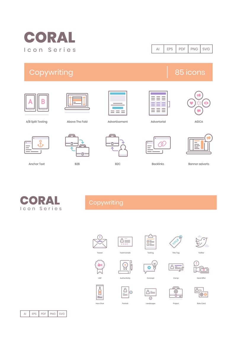 Download Набор иконок "85 Copywriting Icons - Coral Series Set" / 85 Copywriting Icons - Coral Series Set - Набор иконок на тему графика