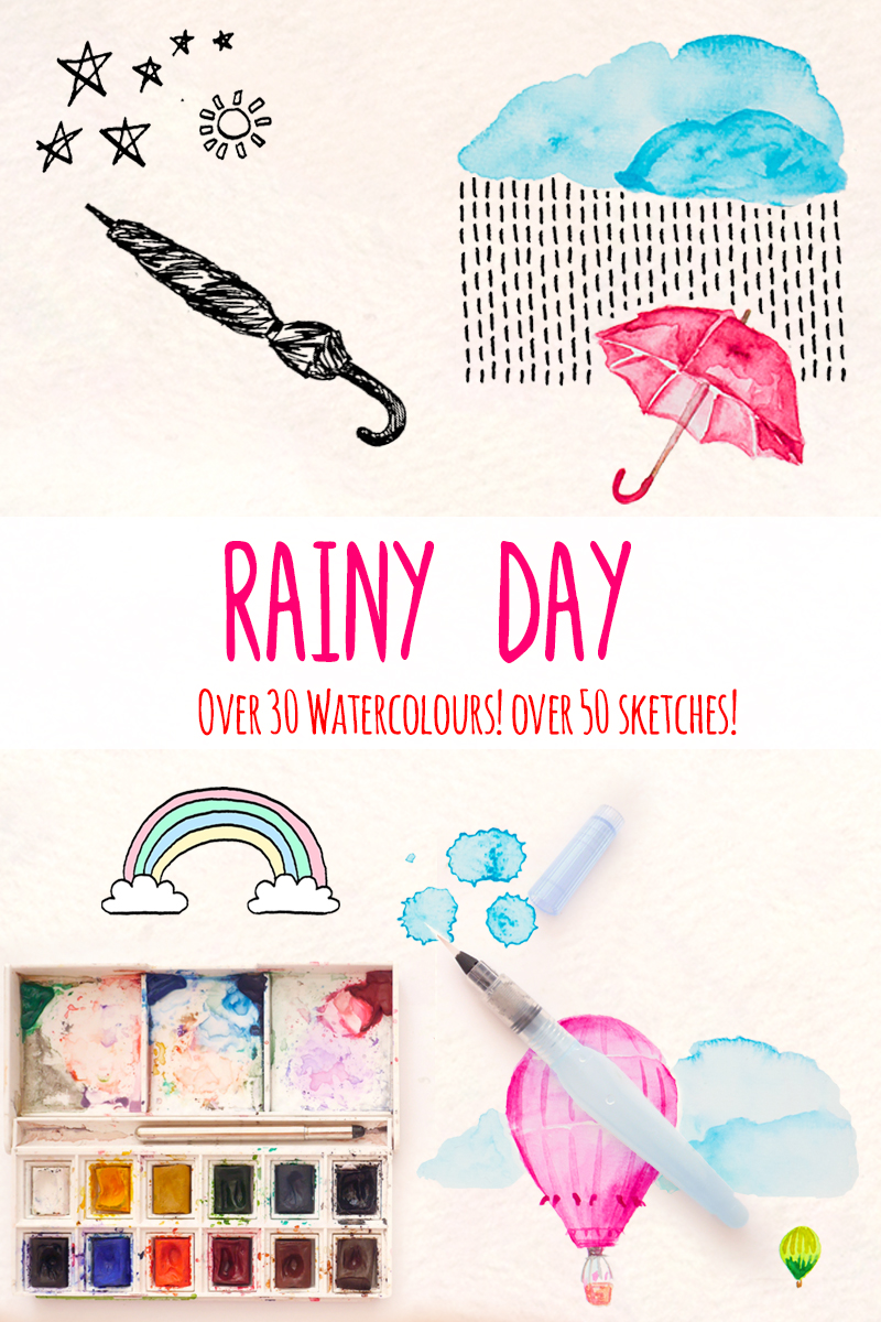 Download Иллюстрация "86 Rain Themed Graphics Elements - Illustration" / 86 Rain Themed Graphics Elements - Illustration - Иллюстрация на тему графика watercolour watercolor painting blog graphics clip art commercial use rainy day weather sky umbrella rain sketches