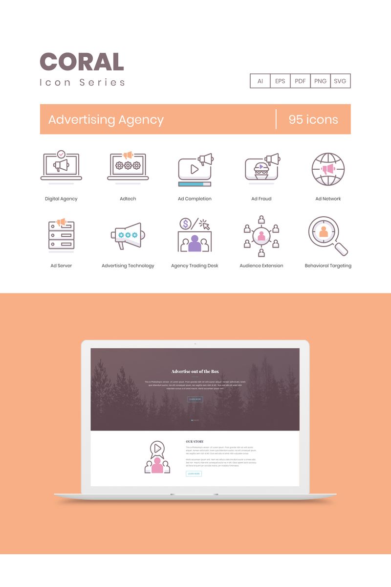 Download Набор иконок "95 Advertising Agency Icons - Coral Series Set" / 95 Advertising Agency Icons - Coral Series Set - Набор иконок на тему графика