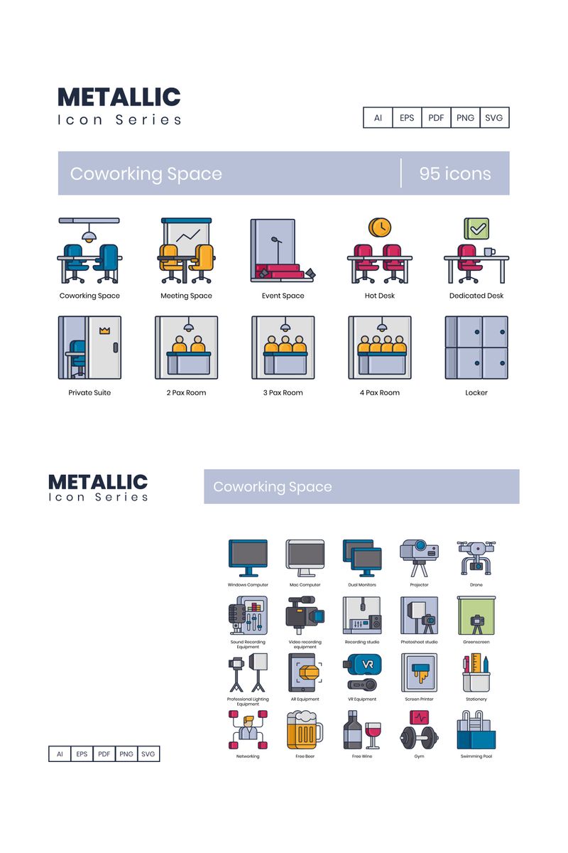Download Набор иконок "95 Coworking Space - Metallic Series Icon Set" / 95 Coworking Space - Metallic Series Icon Set - Набор иконок на тему графика