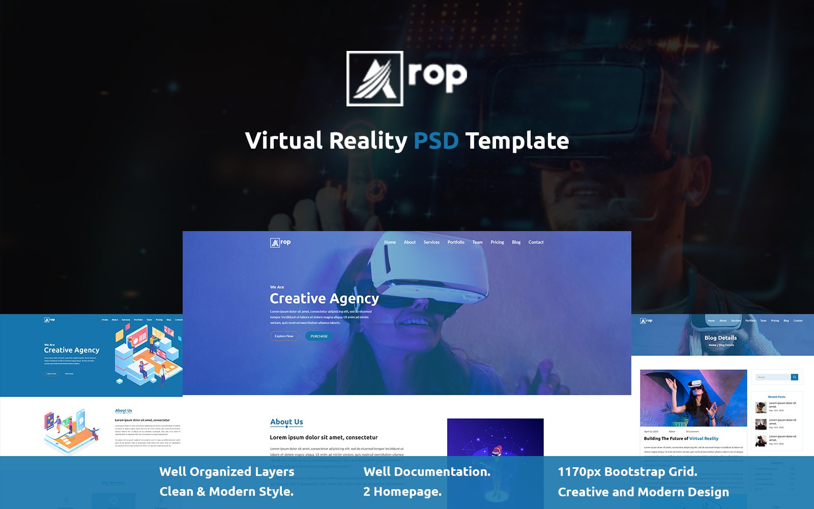 Download PSD шаблон "A-rop- Virtual Reality PSD Template" / A-rop- Virtual Reality PSD Template - PSD шаблон на тему образование и книги app,landing,page,augmented,reality,business,customizer,electronics,shop,software,store,technology,virtual,visual,vr,composer,woocommerce