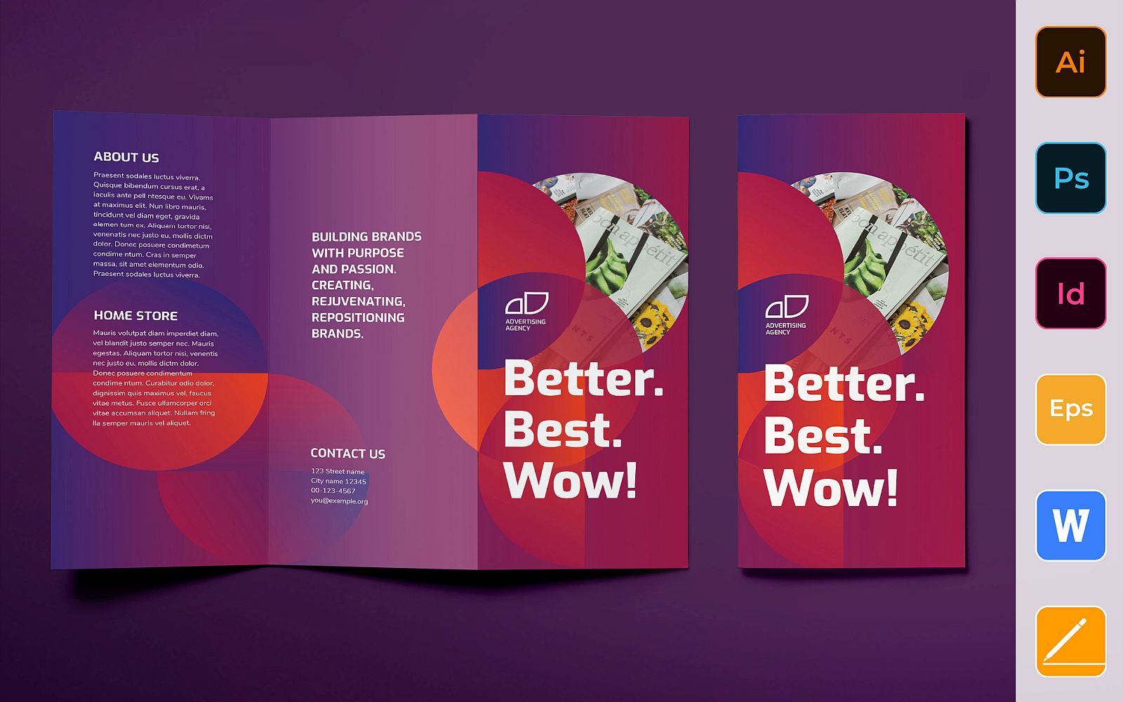 Download Фирменный стиль "Advertising Agency Brochure Trifold - Corporate Identity Template" / Advertising Agency Brochure Trifold - Corporate Identity Template - Фирменный стиль на тему графика brochure,trifold,template,corporate,company,branding,advertising,agency,promotion,marketing,ad,advertiser,blue,red,violet