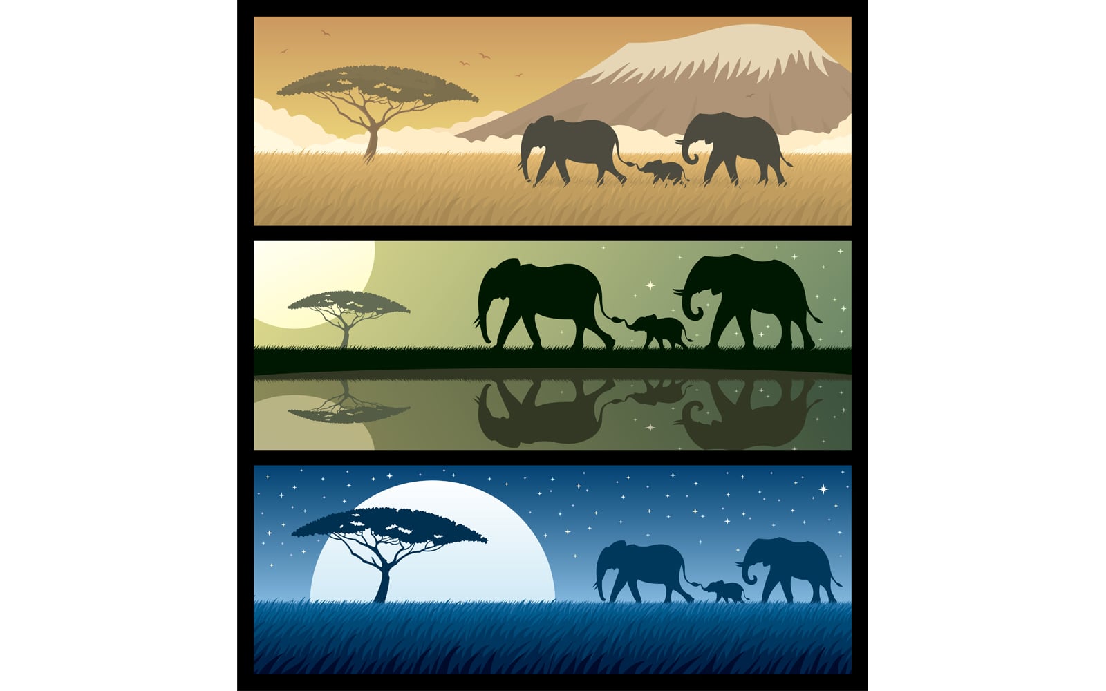 Download Иллюстрация "Africa Landscapes 2 - Illustration" / Africa Landscapes 2 - Illustration - Иллюстрация на тему графика africa,african,landscape,background,banner,elephant,family,baby,savannah,kilimanjaro,tree,acacia,grass,landmark,animals,safari,night,moon