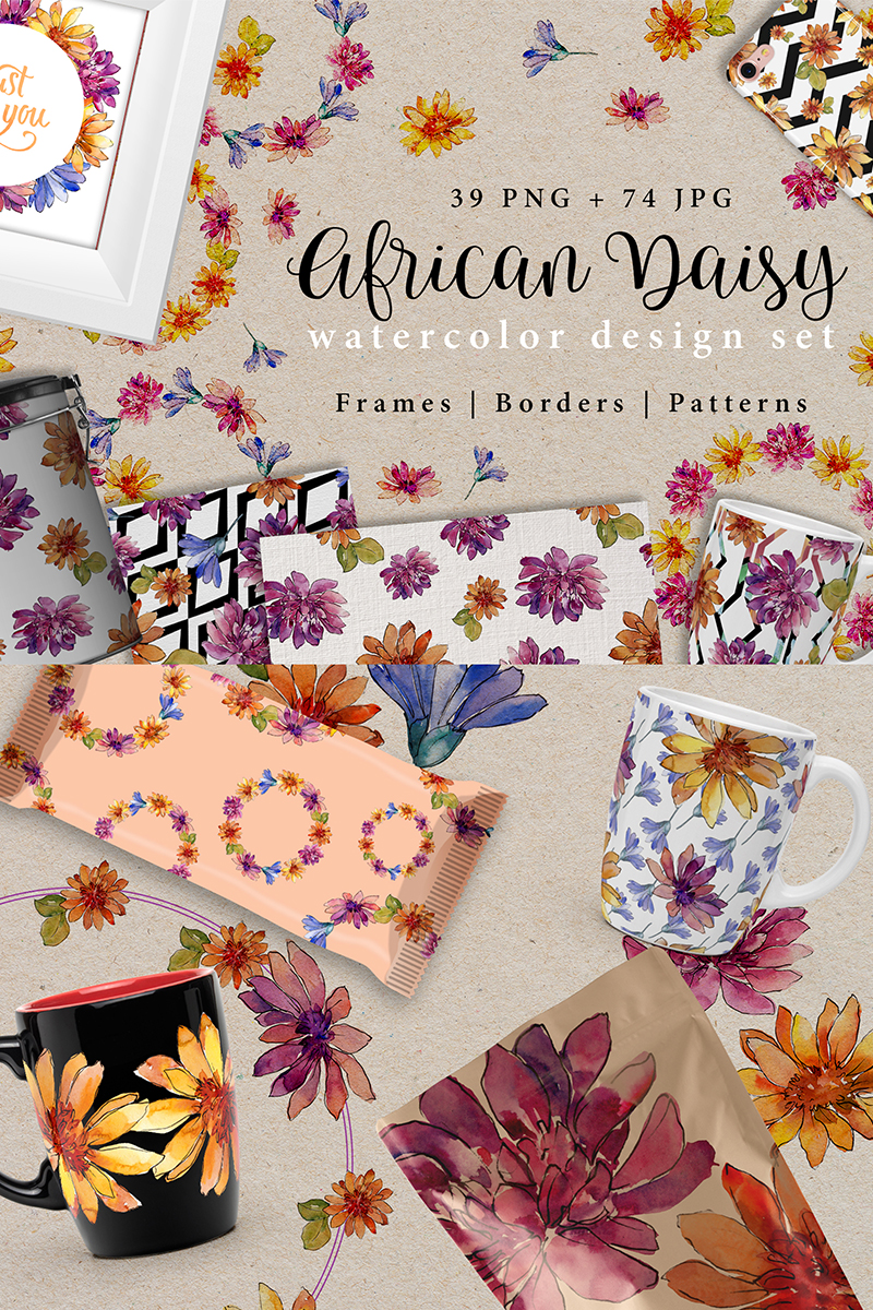 Download Иллюстрация "African Daisy PNG Watercolor Design Set - Illustration" / African Daisy PNG Watercolor Design Set - Illustration - Иллюстрация на тему графика watercolor illustration african daisy drawing background colorful drawn paint pink orange plant wildflower blue seasonal foliage flower sprout stem textile