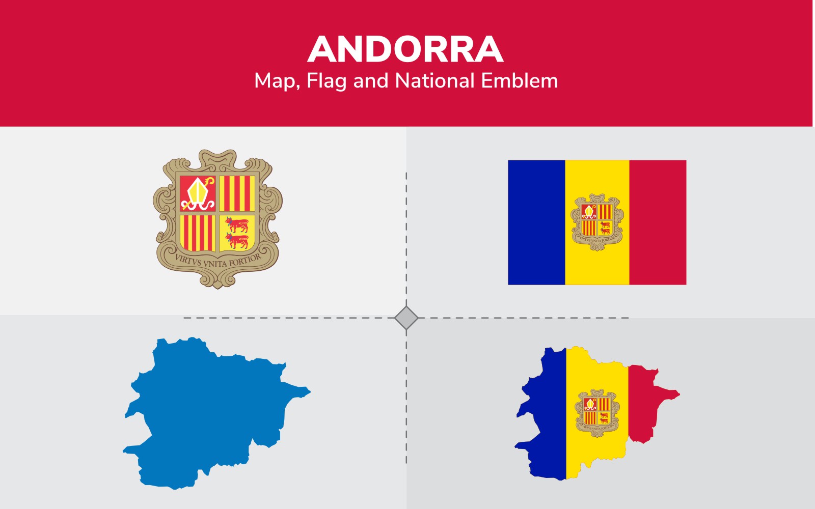 Download Иллюстрация "Andorra Map, Flag and National Emblem - Illustration" / Andorra Map, Flag and National Emblem - Illustration - Иллюстрация на тему графика continents,countries,map,political map,traveling,vector,emblem,national,flag,coat,arms,country,symbol,nations,state,sign,nation,badge,symbolic object,europe
