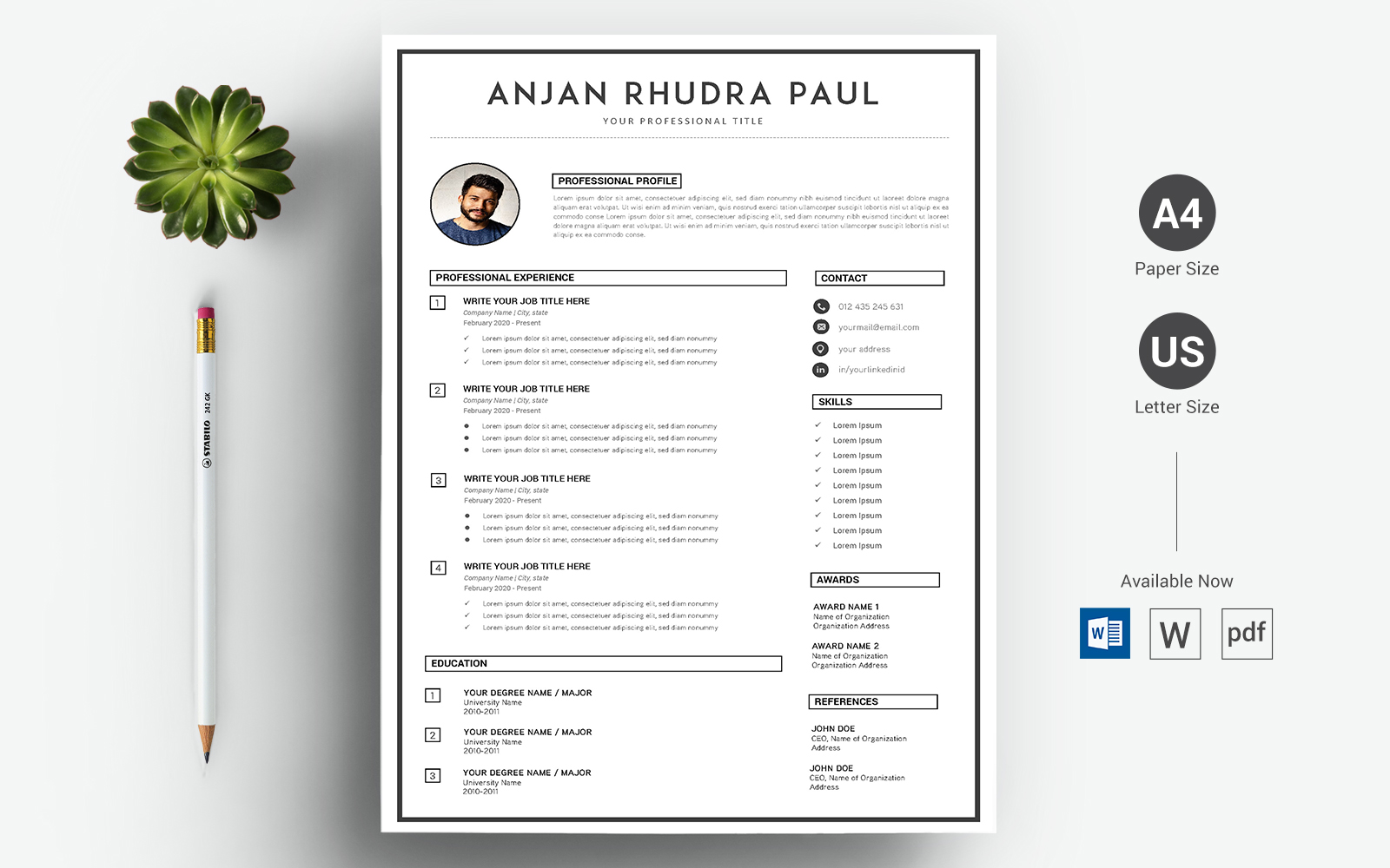 Download Резюме "Anjan Rhudra Paul - CV & Resume Template" / Anjan Rhudra Paul - CV & Resume Template - Резюме на тему графика a4,black resume,bright,clean,cv,cover letter,creative,curriculum vitae,design,template,docx,editable,elegant,job,light,minimal,word,modern,new
