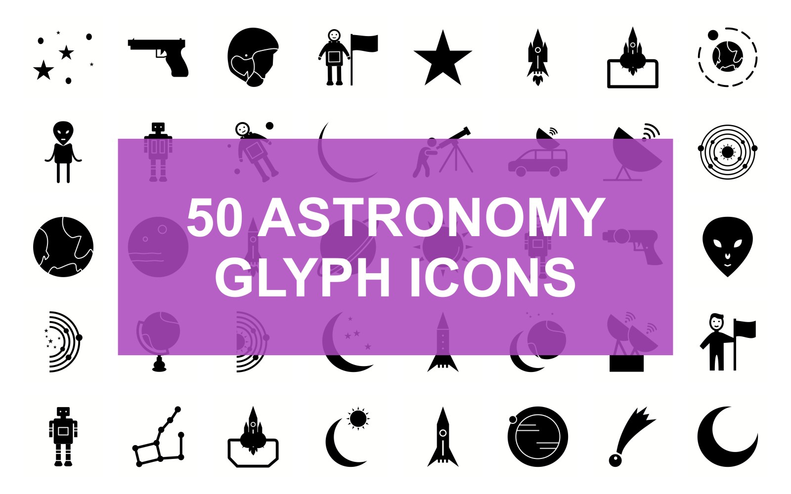 Download Набор иконок "Astronomy Glyph Black Set Icon" / Astronomy Glyph Black Set Icon - Набор иконок на тему графика star,moon,space gun,constellation,new moon,stars,alien abduction,measurement,flag on moon,weapon,helmet,man with flag,space shuttle,rocked launched,moon orbiting earth,alien,robot,space man,a