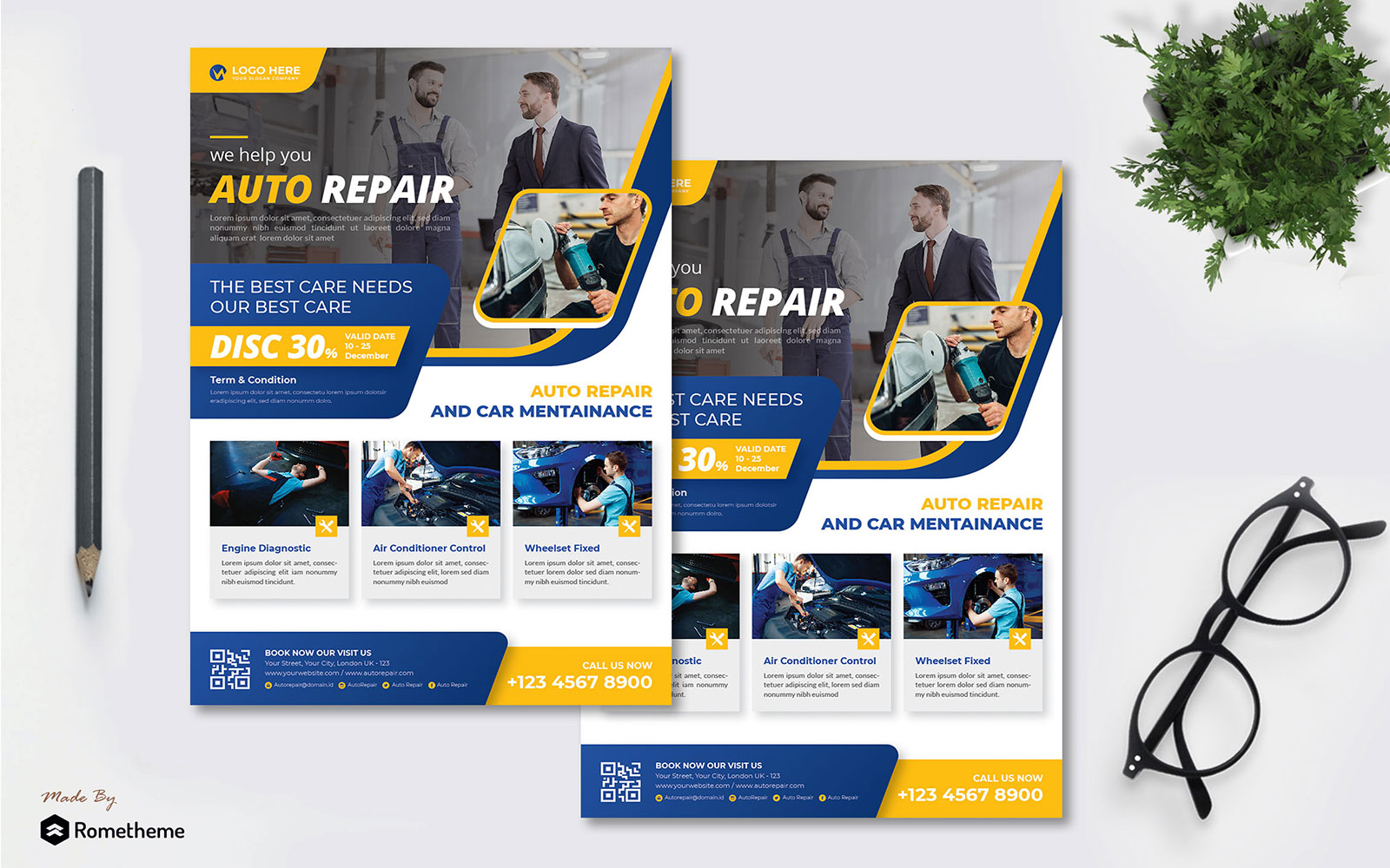 Download Фирменный стиль "Auto Repair - Flyer AC - Corporate Identity Template" / Auto Repair - Flyer AC - Corporate Identity Template - Фирменный стиль на тему графика auto,banner,blue,brochure,business,car,design,flyer,print,promotion,repair,service,yellow no