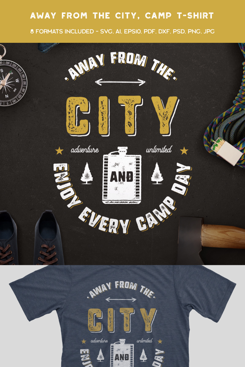 Download T-shirt Design "Away From The City, Camping Retro - T-shirt Design" / Away From The City, Camping Retro - T-shirt Design - T-shirt Design на тему графика adventure t shirt print logo vintage wanderlust mountain hiking template tee design tshirt insignia activity stamp