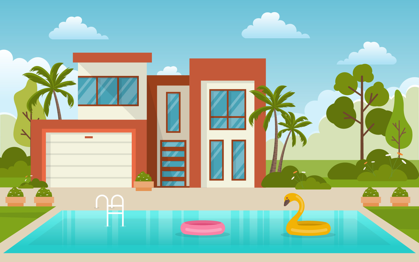Download Иллюстрация "Backyard Modern Concept - Illustration" / Backyard Modern Concept - Illustration - Иллюстрация на тему графика modern,house,villa,exterior,swimming,pool,backyard,illustration,vector,water,day,cloud,blue,tree,top,view,background,poolside,outdoor,summer