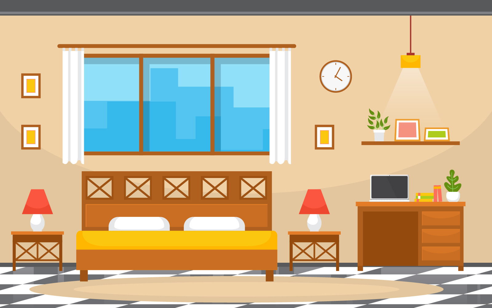 Download Иллюстрация "Bedroom Interior Design - Illustration" / Bedroom Interior Design - Illustration - Иллюстрация на тему графика bedroom,sleeping,room,bed,interior,design,modern,hotel,apartment,illustration,vector,concept,sleep,indoor,comfortable,furniture,double,lamp,table,laptop