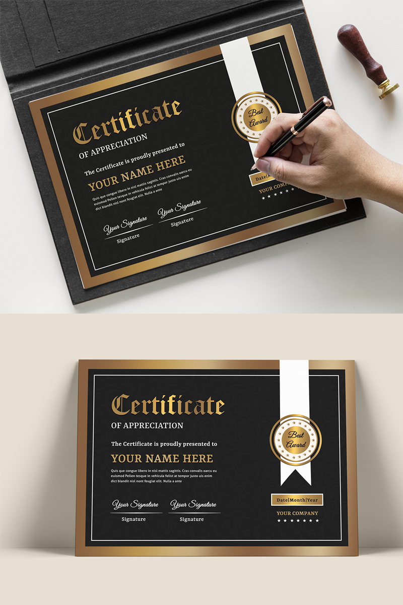 Download Шаблон сертификата "Black & Gold Certificate Template" / Black & Gold Certificate Template - Шаблон сертификата на тему графика certificate,template,award,appreciation,black,gold,photoshop,recognition,achievement,print,clean,minimal,professional,academic,corporate,a4