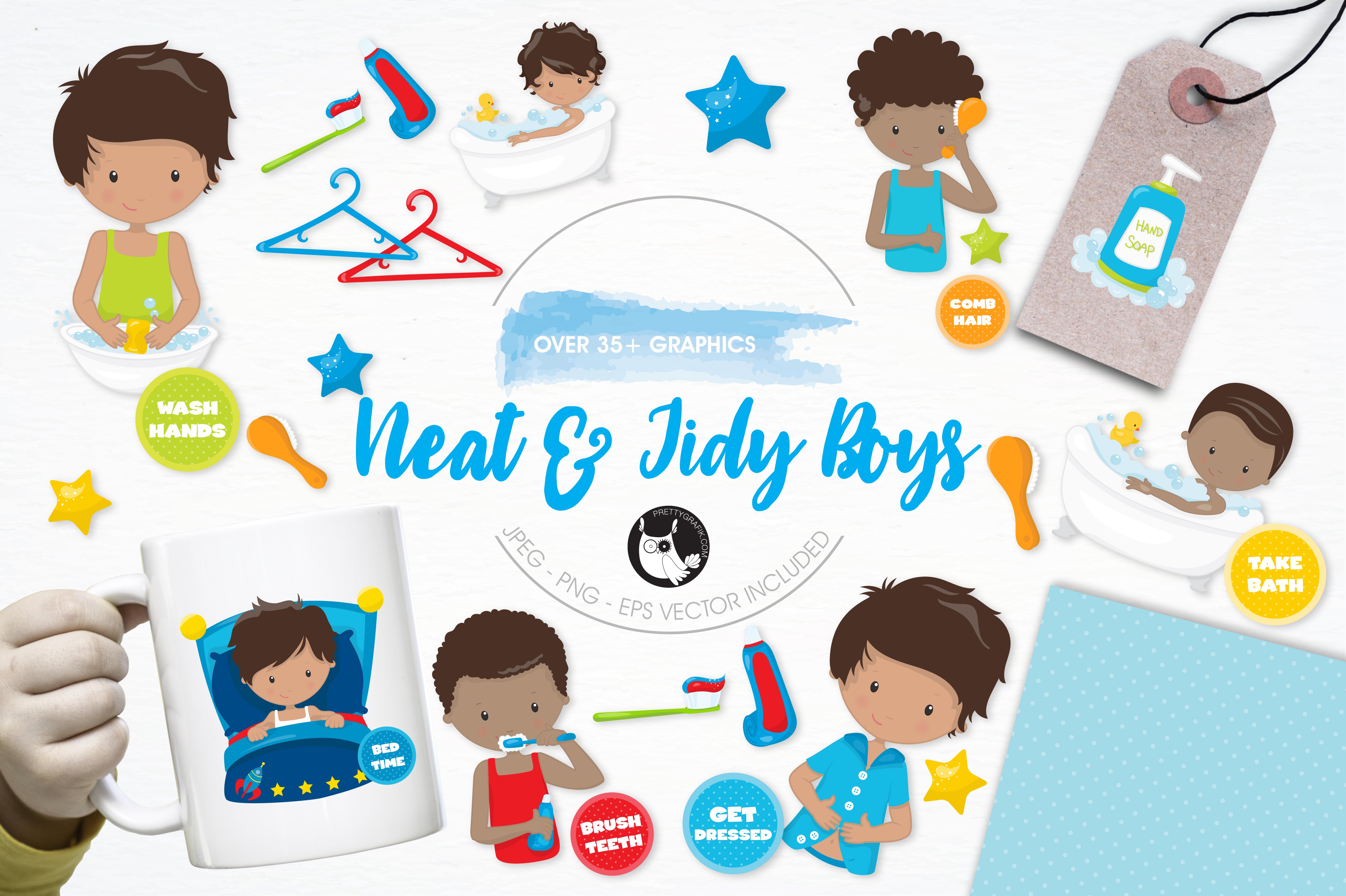 Download Vector "Boys Hygiene Illustration Pack - Vector Image" / Boys Hygiene Illustration Pack - Vector Image - Vector на тему графика brush,illustration,vector,graphics,clipart,clip art,cleaning,hair,icons,hygiene,eps,bath,toothbrush,prettygrafik,bath time,washing hands,hangers,getting dressed,kids chores,kids hygiene