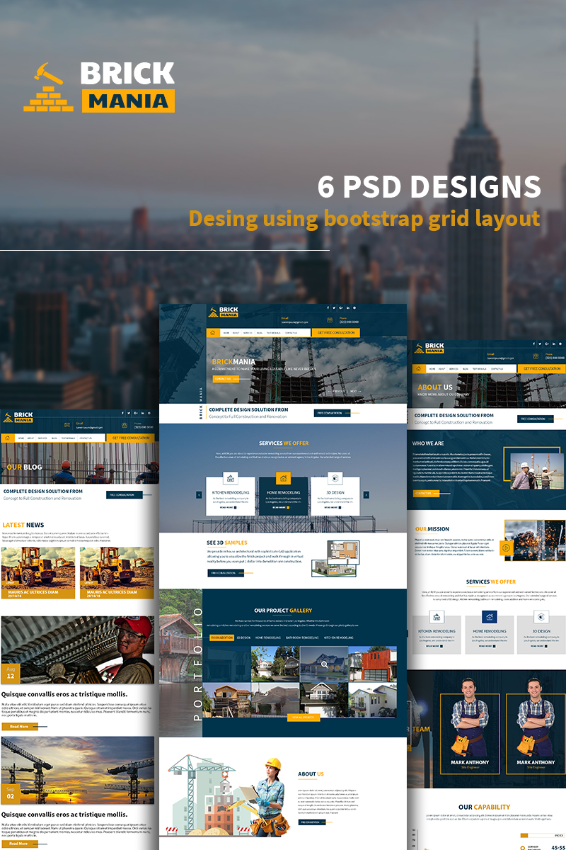 Download PSD шаблон "BrickMania - Multipurpose Construction PSD Template" / BrickMania - Multipurpose Construction PSD Template - PSD шаблон на тему агентство недвижимости construction architecture architectural design bricks skyscrapers projects company real estate agency realtors properties management house homes apartment buildings psd templates