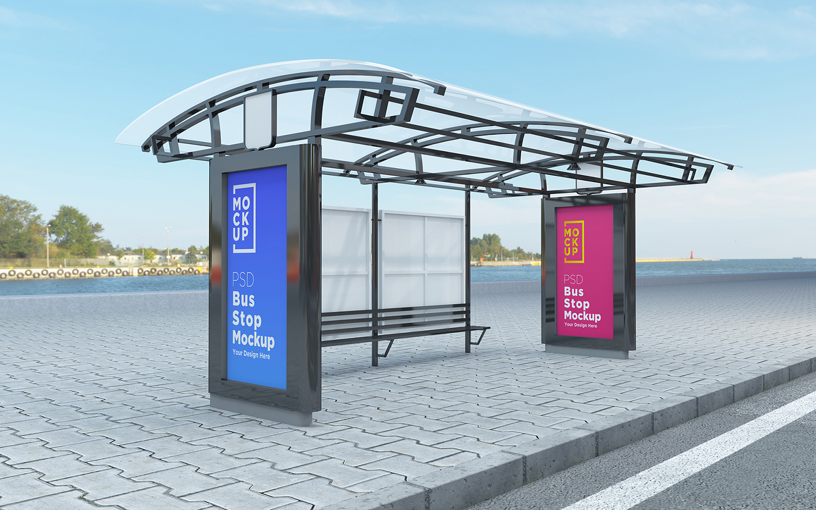 Download Мокап для продукта "Bus Stop with 2 Signage product mockup" / Bus Stop with 2 Signage product mockup - Мокап для продукта на тему графика communication,mock up,signboard,transport,road,roadside,frame,station,billboard,street,city,board,poster,blank,mockup,commercial,bus,stop,advertisement marketing,advertisement
