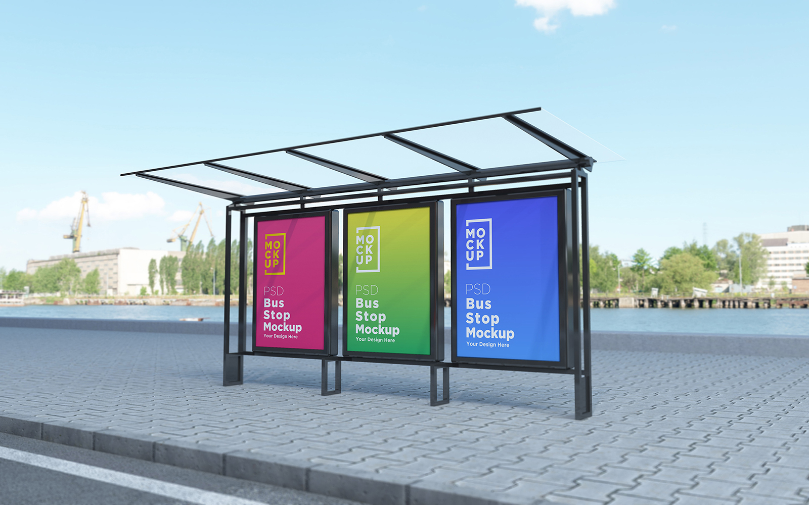 Download Мокап для продукта "Bus Stop with 3 Sign product mockup" / Bus Stop with 3 Sign product mockup - Мокап для продукта на тему графика communication,mock up,signboard,transport,road,roadside,frame,station,billboard,street,city,board,poster,blank,mockup,commercial,bus,stop,advertisement marketing,advertisement