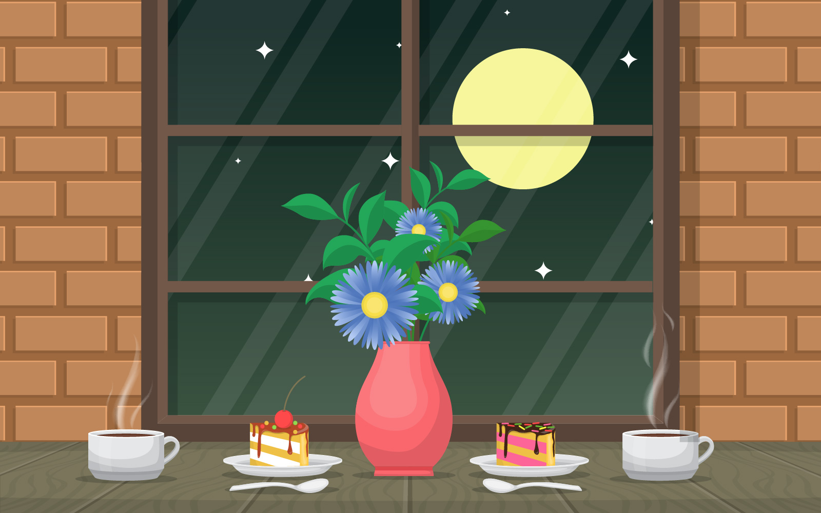 Download Иллюстрация "Cake Coffee Cafe - Illustration" / Cake Coffee Cafe - Illustration - Иллюстрация на тему графика cake,flower,cup,coffee,table,cafe,restaurant,illustration,vector,window,moon,vase,sweet,design,flat,style,background,apartment,wall,comfortable