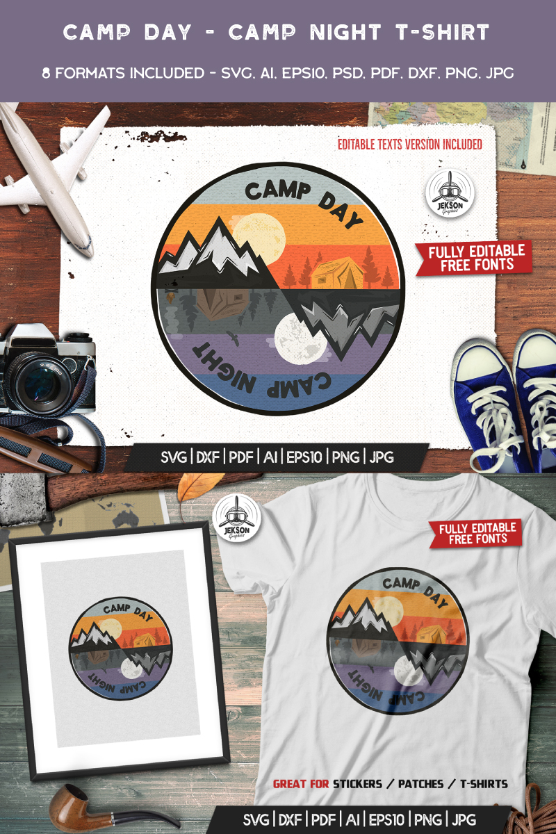 Download T-shirt Design "Camp Day Camp Night - T-shirt Design" / Camp Day Camp Night - T-shirt Design - T-shirt Design на тему графика adventure tshirt print logo vintage wanderlust mountain hiking template tee design insignia activity stamp