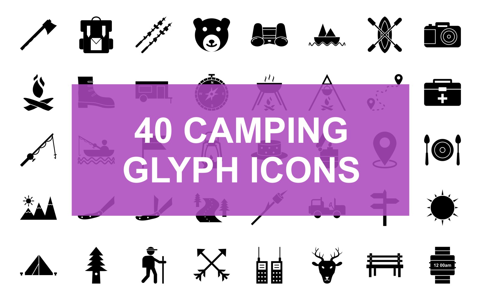 Download Набор иконок "Camping Glyph Black Set Icon" / Camping Glyph Black Set Icon - Набор иконок на тему графика axe,bag pack,barbecue,bear,binoculars,boat,camera,camp fire,camping boot,camping trailer,compass,cooking food,distance,first aid box,fishing rod,fishing,flag,camping,gas lamp,hat