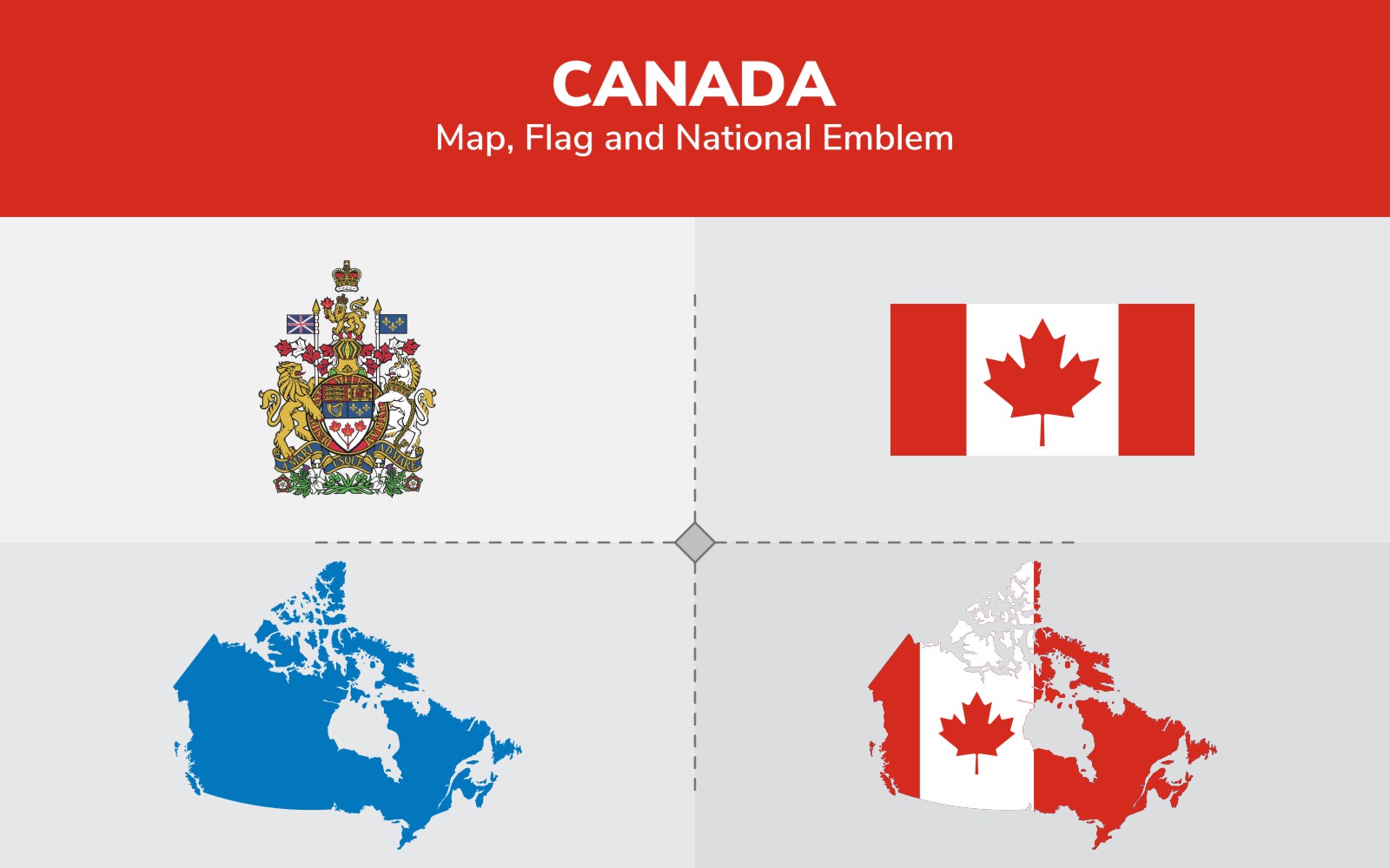 Download Иллюстрация "Canada Map, Flag and National Emblem - Illustration" / Canada Map, Flag and National Emblem - Illustration - Иллюстрация на тему графика continents,countries,map,political map,traveling,vector,emblem,national,flag,coat,arms,country,symbol,nations,state,sign,nation,badge,symbolic object,europe