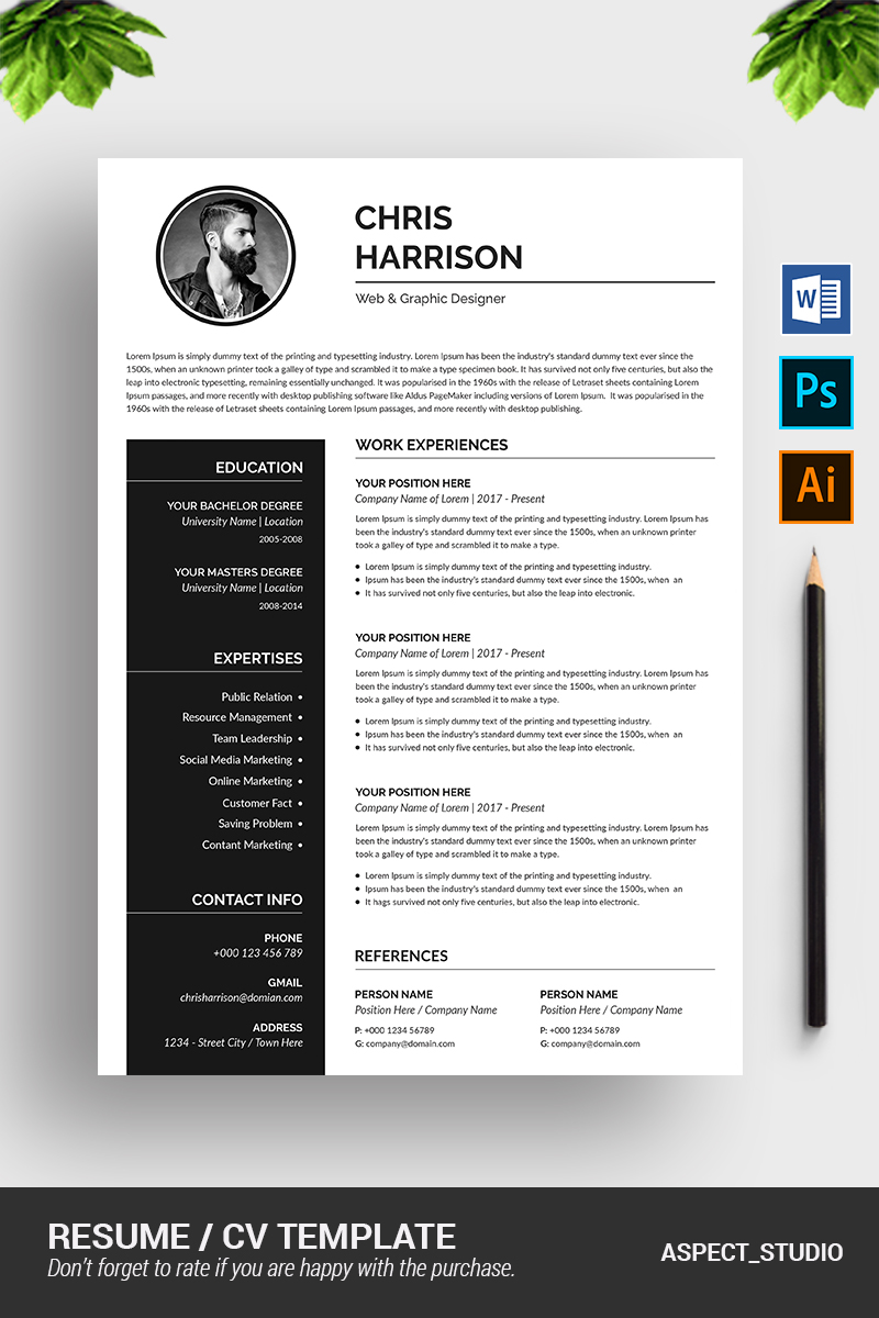 Download Резюме "Chris Harrison Resume Template" / Chris Harrison Resume Template - Резюме на тему графика 1 page resume 2 3 a4 clean cover letter creative cv design document docx elegant employment infographic minimalist modern ms