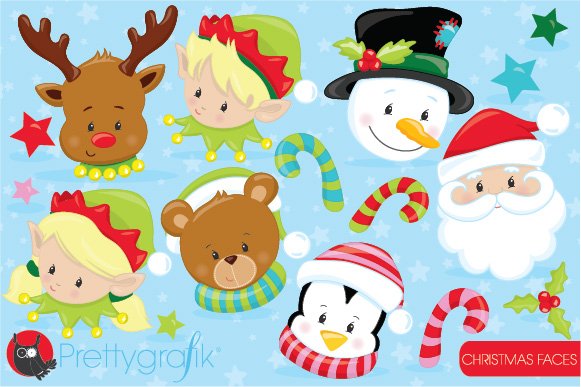 Download Vector "Christmas Faces Clipart - Vector Image" / Christmas Faces Clipart - Vector Image - Vector на тему графика christmas,illustration,vector,clipart,stars,holiday,clip art,elves,elf,snowman,reindeer,mistletoe,penguin,santa-claus,candy cane,faces,teddy bear