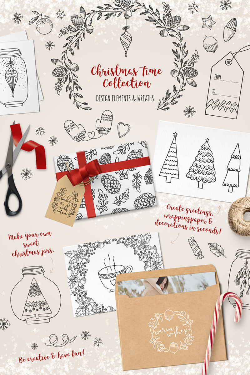 Download Иллюстрация "Christmas Time Collection - Illustration" / Christmas Time Collection - Illustration - Иллюстрация на тему графика christmas wreath elements handdrawn handmade diy lettering text wording overlays tree ball tag flowers gift vector set collection floral deer