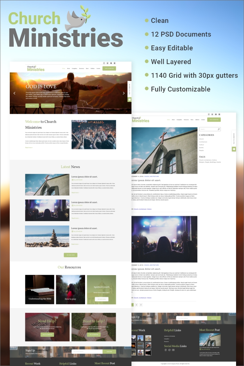Download PSD шаблон "Church Ministries PSD Template" / Church Ministries PSD Template - PSD шаблон на тему христианство clean religious church ministry green layered customizable