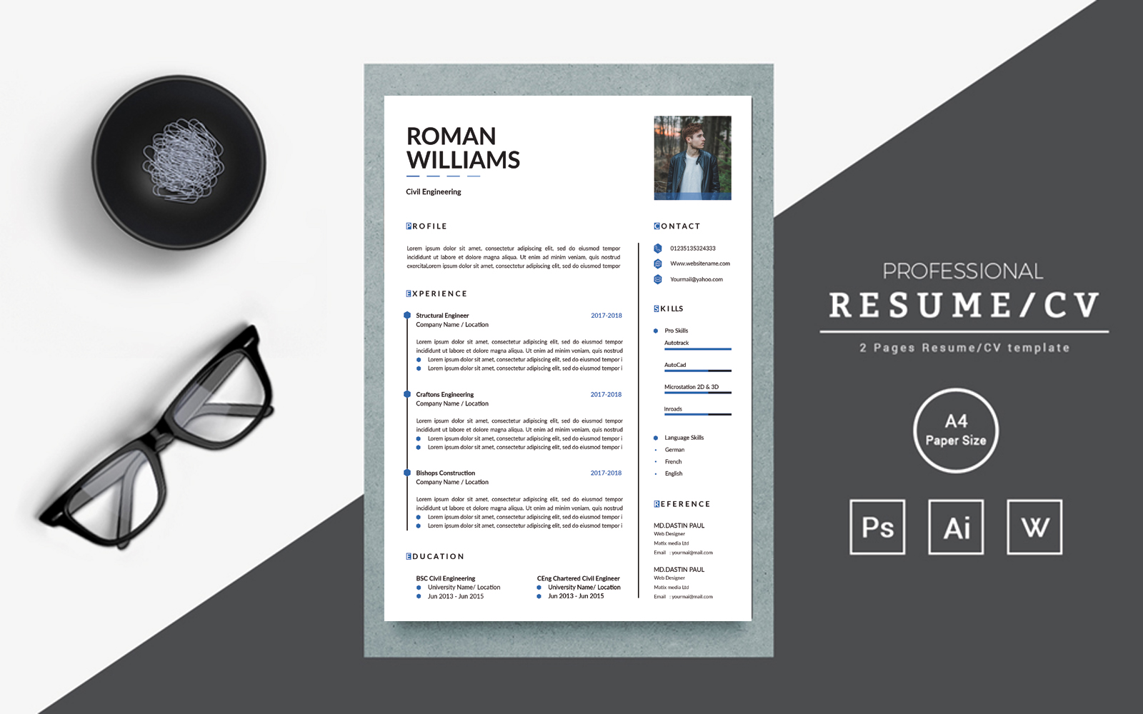 Download Резюме "Civil Engineer Resume Template" / Civil Engineer Resume Template - Резюме на тему графика a4,black,blue,clean,clean resume,creative,cv,cv clean,cv template,design,elegant,elegant resume,female,female resume,feminine,indesign,infographic,microsoft word,minimalist,modern