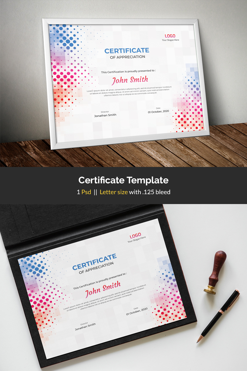 Download Шаблон сертификата "Colored Certificate Template" / Colored Certificate Template - Шаблон сертификата на тему графика certificate,template,achievement,appreciation,border,frame,background,colored,print,psd,colorful,dots,circles,halftone,mosaic,pixels,pattern,squares