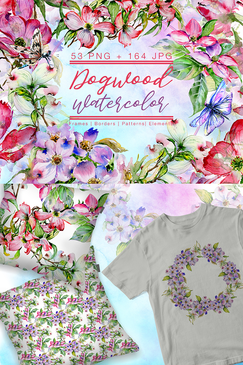 Download Иллюстрация "Cool Dogwood Colorful Flower PNG Watercolor Set - Illustration" / Cool Dogwood Colorful Flower PNG Watercolor Set - Illustration - Иллюстрация на тему графика watercolor illustration delicate drawing background white colorful drawn paint leaf purple plant dogwood wildflower seasonal foliage flower sprout pink stem