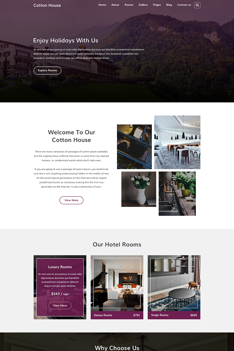 Download PSD шаблон "Cotton House | Resort, Hotel and Holiday PSD Template" / Cotton House | Resort, Hotel and Holiday PSD Template - Адаптивный PSD шаблон на тему гостиницы accommodation bed-and-breakfast booking food holiday hotel motel reservation resort room rooms travel vacation apartments luxury villa plan-your-holiday restaurants ticket-booking