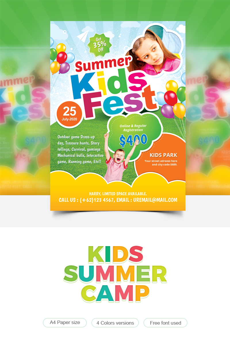 Download Фирменный стиль "Creative - Summer Kids Fest Flyer - Corporate Identity Template" / Creative - Summer Kids Fest Flyer - Corporate Identity Template - Фирменный стиль на тему графика summer kids fest camp flyer school activity adventure boys camping child colorful festival girls holiday kid party play recreation spring
