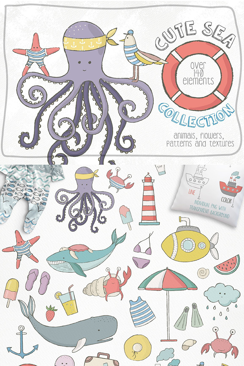 Download Иллюстрация "Cute Sea Collection - Illustration" / Cute Sea Collection - Illustration - Иллюстрация на тему графика sea ocean nautical marine octopus fish pattern seamless holiday invite branding social media botanical fashion abstract retro vintage storiesundefined book